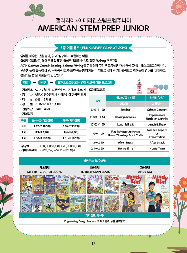 ASPK Summer Camp는 Reading, Science, Writing을 균형 있게 구성한 초등학생 대상 영어 몰입형 학습 프로그램입니다.