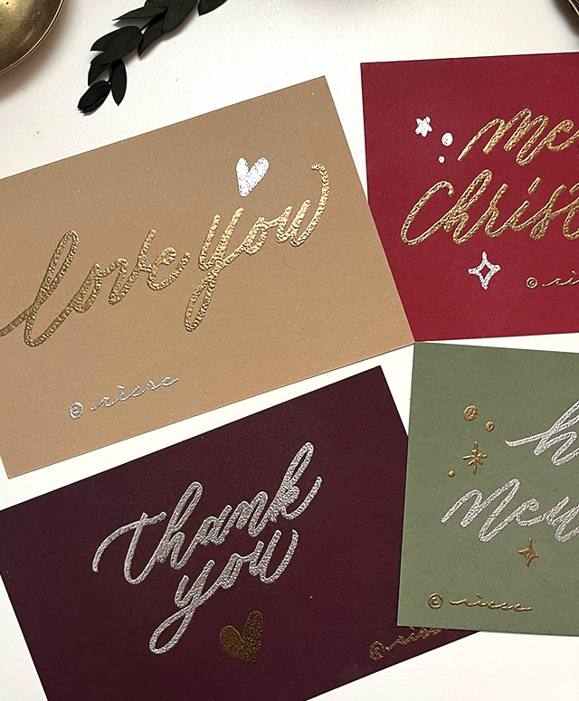 한번 배워 계속 사용할 수 있는 모던 스타일의 영문 캘리그라피 라이팅 기법을 배워보고, 엠보싱 파우더와 펜으로 연말연시 활용하기 좋은 나만의 카드엽서 작품들도 완성해 봅니다.