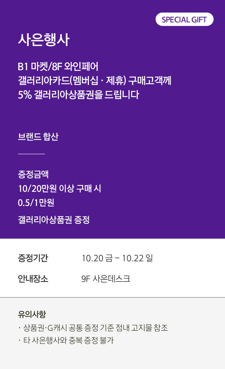사은행사 [B1 마켓/8F 와인페어] 갤러리아카드(멤버십 ・ 제휴) 구매고객께 5% 갤러리아상품권을 드립니다 10.20 금 - 10.22 일 페이스북에 공유하기 카카오스토리로 공유하기 PREV 목록 NEXT
