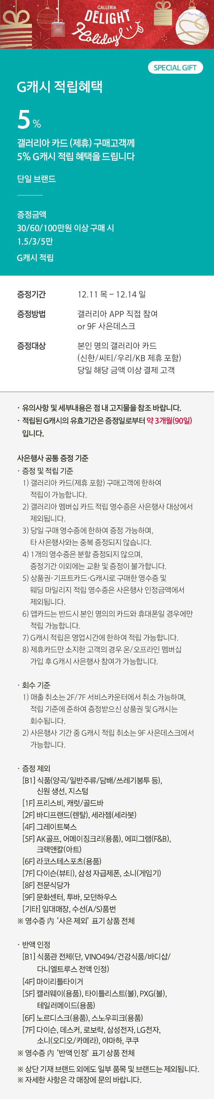 갤러리아 카드 (제휴) 구매고객께 5% G캐시 적립 혜택을 드립니다