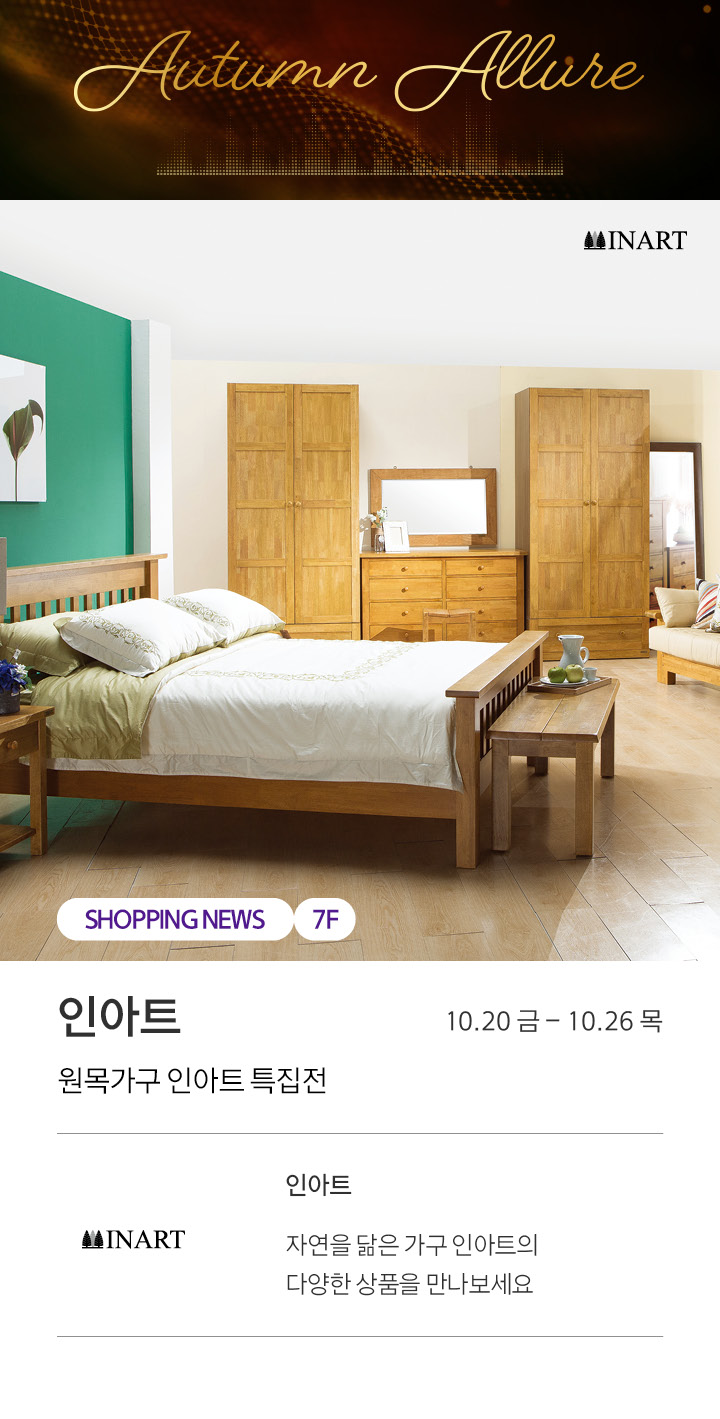 상품행사 원목가구 인아트 특집전 10.20 금 - 10.26 목 페이스북에 공유하기 카카오스토리로 공유하기 PREV 목록 NEXT 설 선물세트 예약 판매는 아래 번호로 문의 부탁드립니다. 센터시티 041.411.5309, 5311 확인