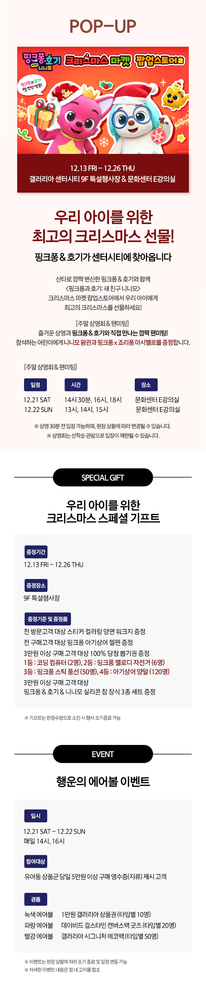뉴오프닝&팝업 핑크퐁 팝업스토어 12.13 금 - 12.26 목 페이스북에 공유하기 카카오스토리로 공유하기 PREV 목록 NEXT 설 선물세트 예약 판매는 아래 번호로 문의 부탁드립니다. 센터시티 041.411.5309, 5311 확인