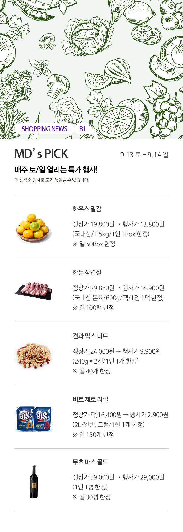 상품행사 MD’s PICK 매주 토/일 열리는 특가 행사! 9.13 토 - 9.14 일 페이스북에 공유하기 카카오스토리로 공유하기 PREV 목록 NEXT 설 선물세트 예약 판매는 아래 번호로 문의 부탁드립니다. 센터시티 041.411.5309, 5311 확인