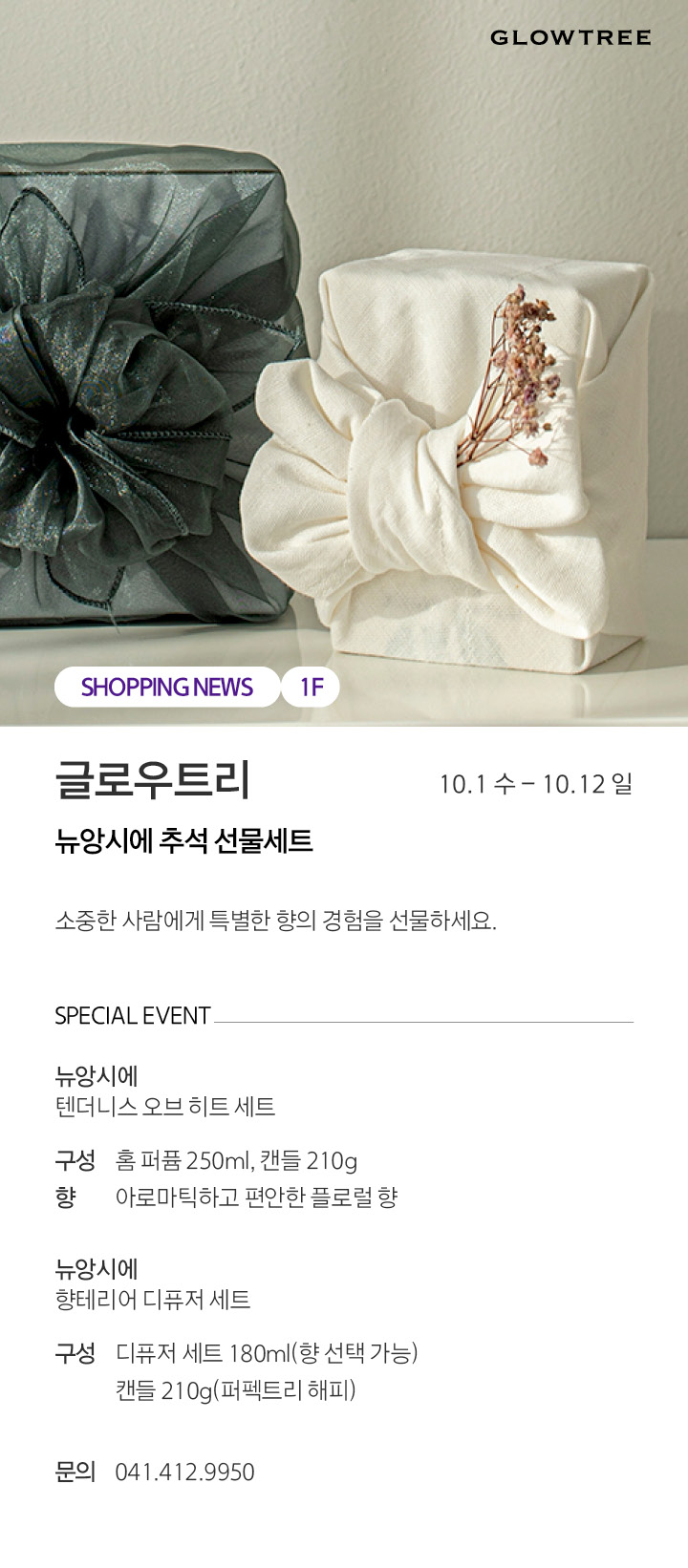 상품행사 글로우트리 뉴앙시에 추석 선물세트 10.1 수 - 10.12 일 페이스북에 공유하기 카카오스토리로 공유하기 PREV 목록 NEXT 설 선물세트 예약 판매는 아래 번호로 문의 부탁드립니다. 센터시티 041.411.5309, 5311 확인