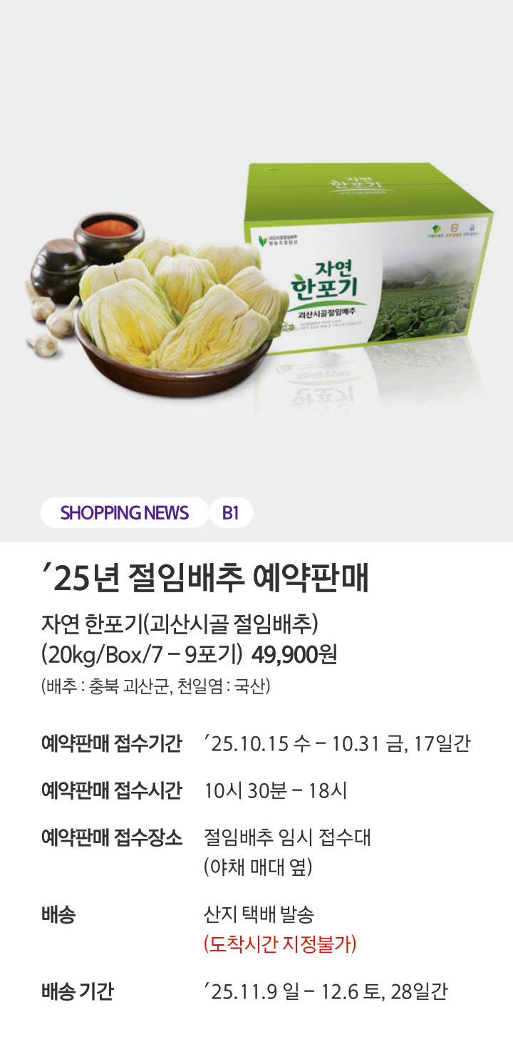 상품행사 25년 절임배추 예약판매 10.15 수 - 10.31 금 페이스북에 공유하기 카카오스토리로 공유하기 PREV 목록 NEXT 설 선물세트 예약 판매는 아래 번호로 문의 부탁드립니다. 센터시티 041.411.5309, 5311 확인