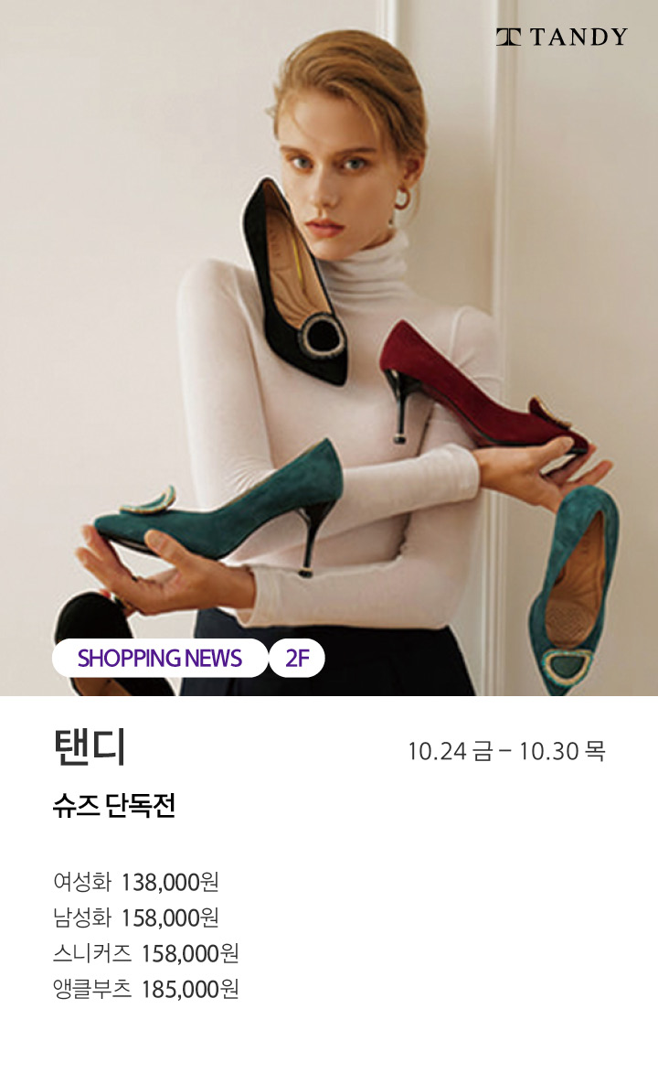 상품행사 탠디 슈즈 단독전 10.24 금 - 10.30 목 페이스북에 공유하기 카카오스토리로 공유하기 PREV 목록 NEXT 설 선물세트 예약 판매는 아래 번호로 문의 부탁드립니다. 센터시티 041.411.5309, 5311 확인