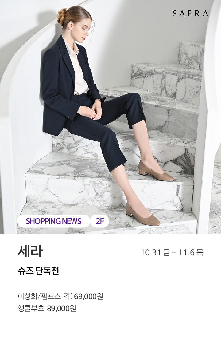 상품행사 세라 슈즈 단독전 10.31 금 - 11.6 목 페이스북에 공유하기 카카오스토리로 공유하기 PREV 목록 NEXT 설 선물세트 예약 판매는 아래 번호로 문의 부탁드립니다. 센터시티 041.411.5309, 5311 확인