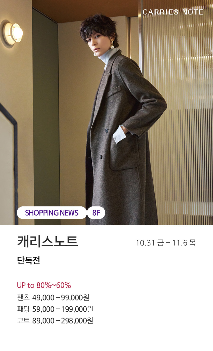 상품행사 캐리스노트 단독전 10.31 금 - 11.6 목 페이스북에 공유하기 카카오스토리로 공유하기 PREV 목록 NEXT 설 선물세트 예약 판매는 아래 번호로 문의 부탁드립니다. 센터시티 041.411.5309, 5311 확인
