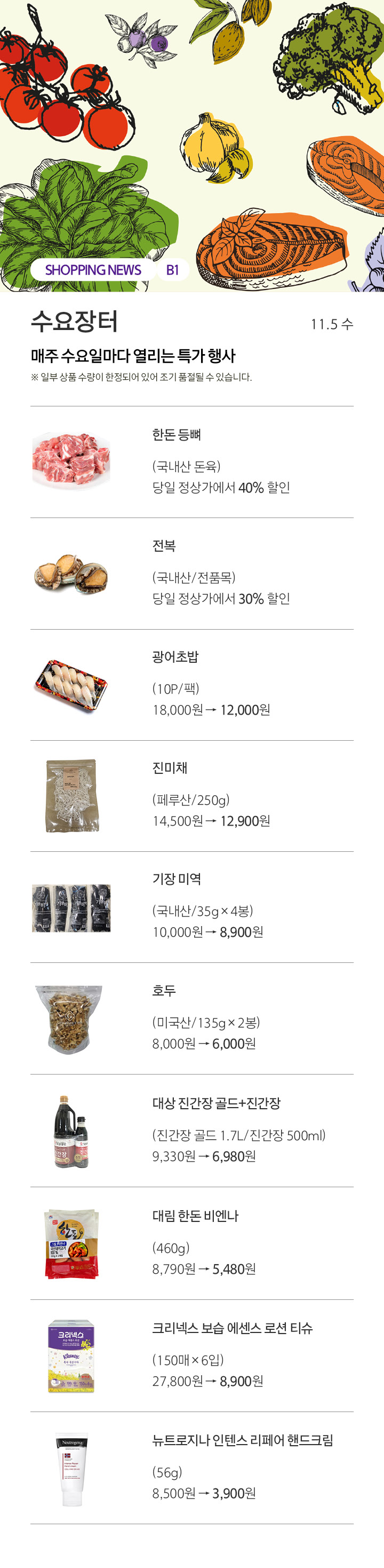 상품행사 수요장터 매주 수요일마다 열리는 특가 행사 11.5 수 페이스북에 공유하기 카카오스토리로 공유하기 PREV 목록 NEXT 설 선물세트 예약 판매는 아래 번호로 문의 부탁드립니다. 센터시티 041.411.5309, 5311 확인