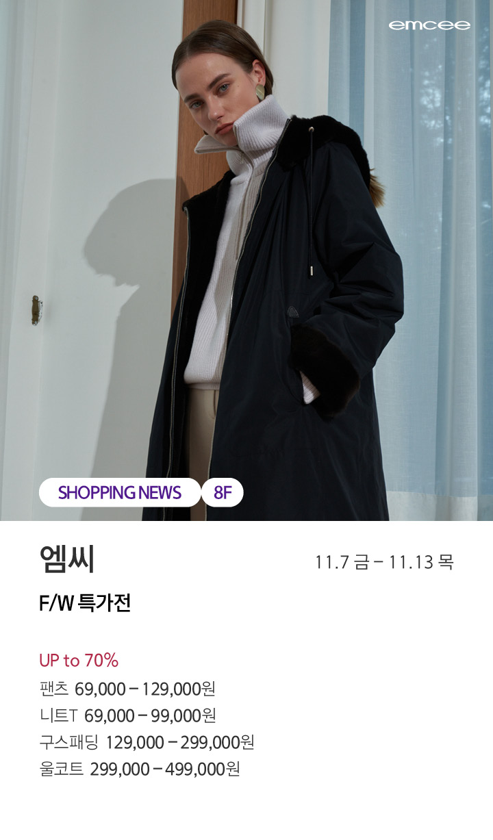 상품행사 엠씨 F/W 특가전 11.7 금 - 11.13 목 페이스북에 공유하기 카카오스토리로 공유하기 PREV 목록 NEXT 설 선물세트 예약 판매는 아래 번호로 문의 부탁드립니다. 센터시티 041.411.5309, 5311 확인