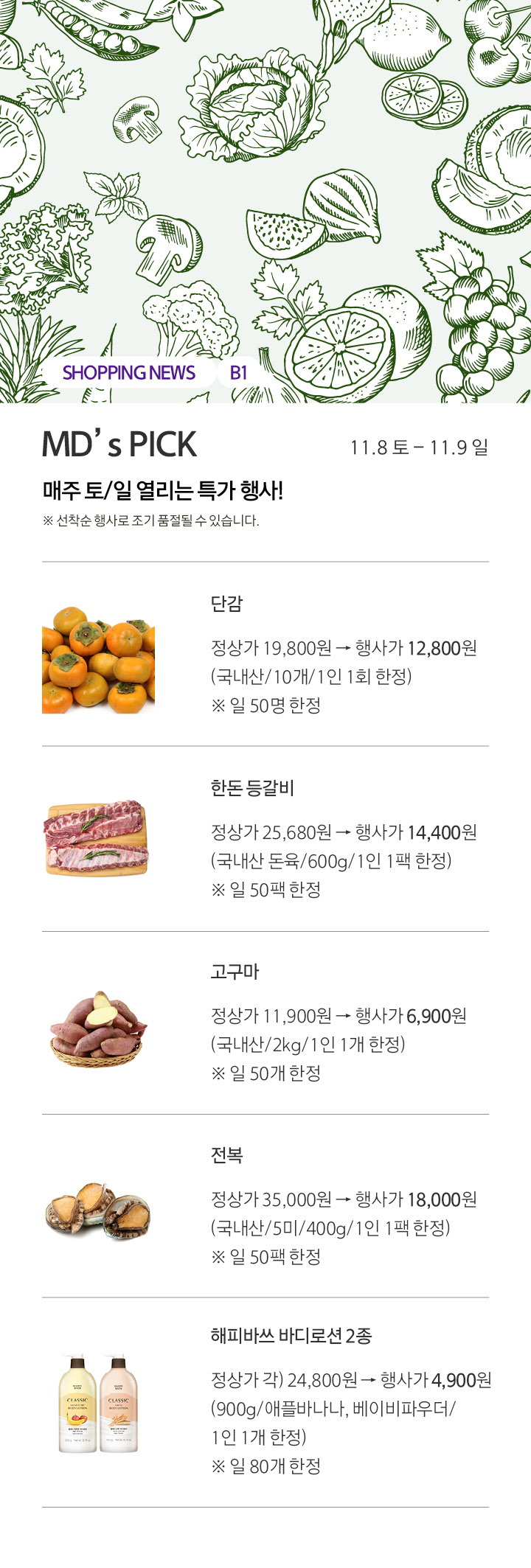 상품행사 MD’s PICK 매주 토/일 열리는 특가 행사! 11.8 토 - 11.9 일 페이스북에 공유하기 카카오스토리로 공유하기 PREV 목록 NEXT 설 선물세트 예약 판매는 아래 번호로 문의 부탁드립니다. 센터시티 041.411.5309, 5311 확인