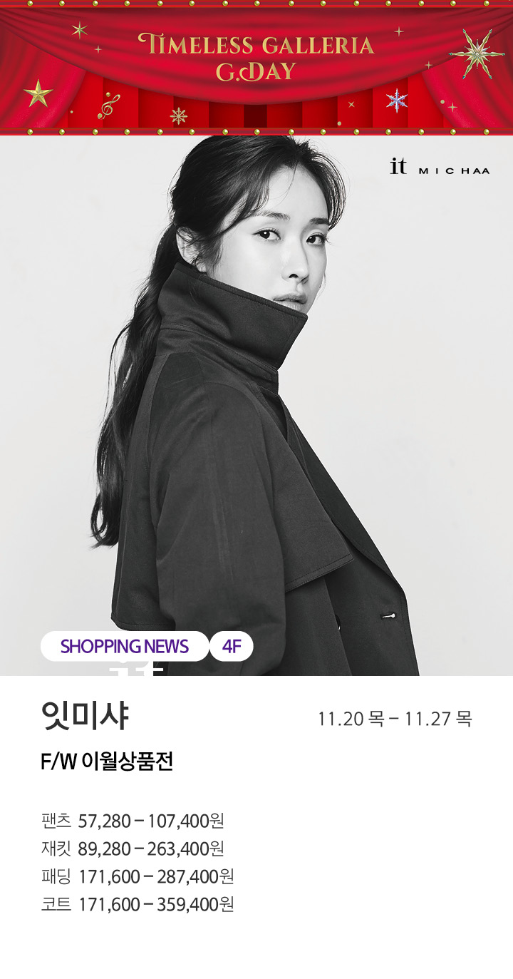 상품행사 잇미샤 F/W 이월상품전 11.20 목 - 11.27 목 페이스북에 공유하기 카카오스토리로 공유하기 PREV 목록 NEXT 설 선물세트 예약 판매는 아래 번호로 문의 부탁드립니다. 센터시티 041.411.5309, 5311 확인