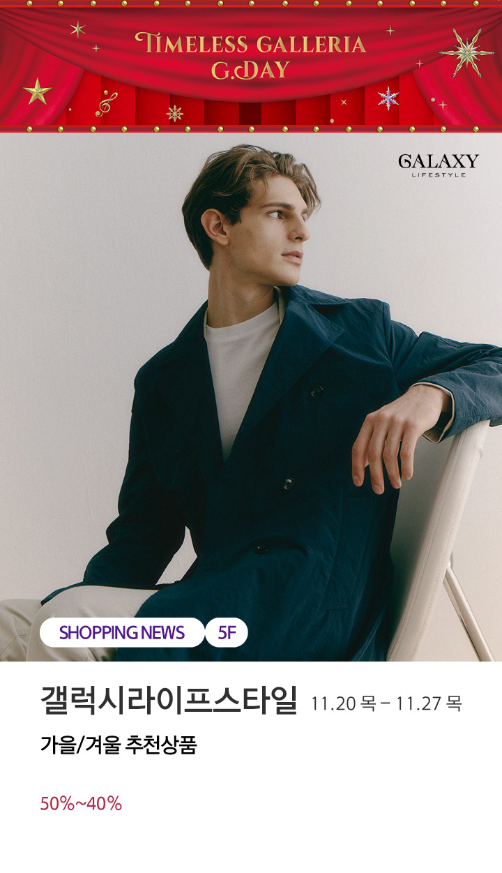상품행사 갤럭시라이프스타일 가을/겨울 추천상품 11.20 목 - 11.27 목 페이스북에 공유하기 카카오스토리로 공유하기 PREV 목록 NEXT 설 선물세트 예약 판매는 아래 번호로 문의 부탁드립니다. 센터시티 041.411.5309, 5311 확인