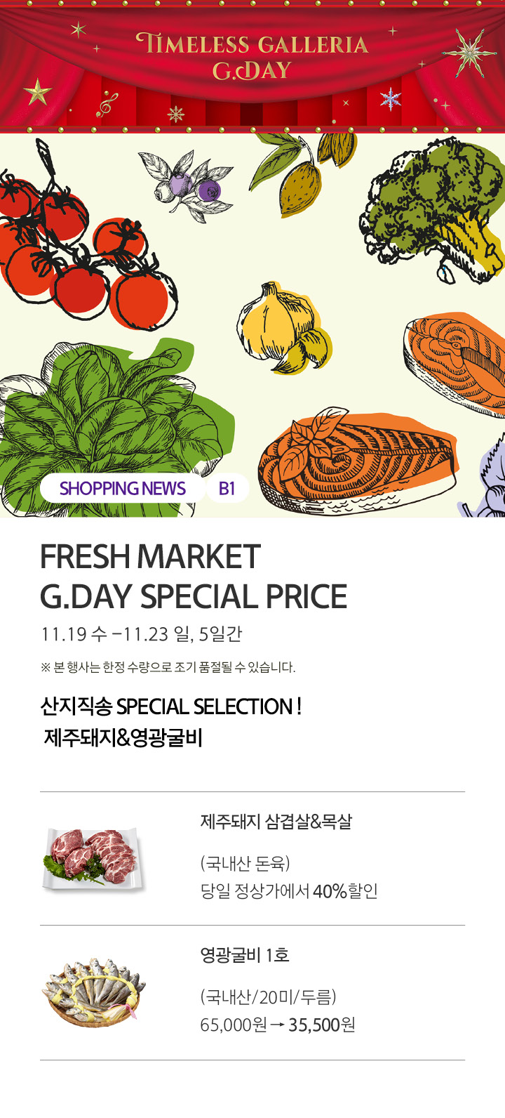 상품행사 FRESH MARKE G.DAY SPECIAL PRICE 11.19 수 -11.23 일 페이스북에 공유하기 카카오스토리로 공유하기 PREV 목록 NEXT 설 선물세트 예약 판매는 아래 번호로 문의 부탁드립니다. 센터시티 041.411.5309, 5311 확인