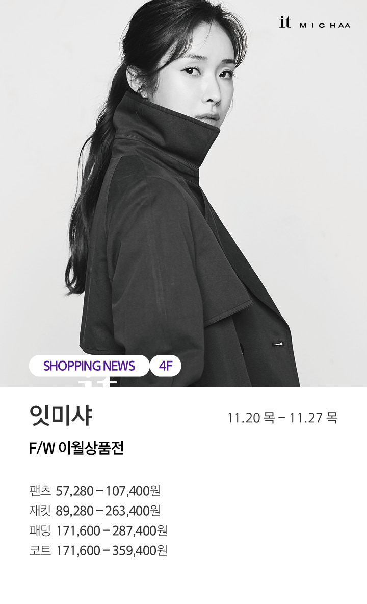 상품행사 잇미샤 F/W 이월상품전 11.20 목 - 11.27 목 페이스북에 공유하기 카카오스토리로 공유하기 PREV 목록 NEXT 설 선물세트 예약 판매는 아래 번호로 문의 부탁드립니다. 센터시티 041.411.5309, 5311 확인