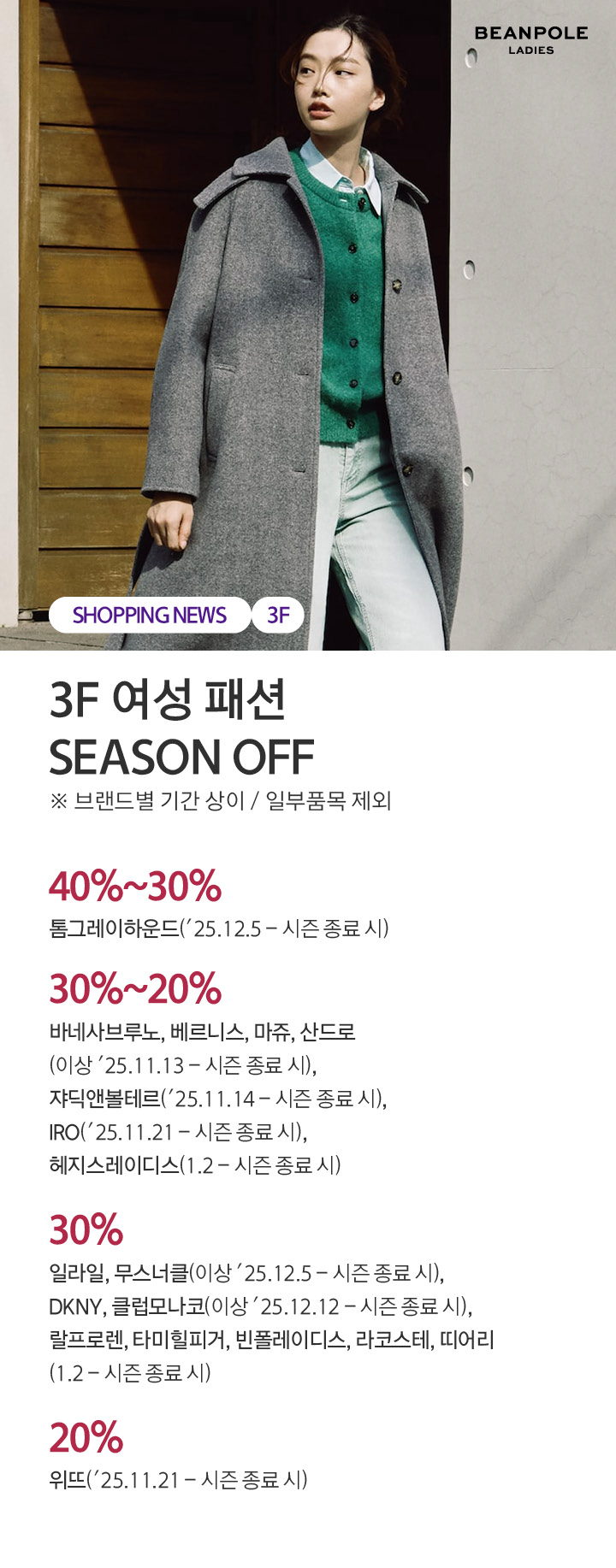 상품행사 3F 여성 패션 SEASON OFF 브랜드별 기간 상이 페이스북에 공유하기 카카오스토리로 공유하기 PREV 목록 NEXT 설 선물세트 예약 판매는 아래 번호로 문의 부탁드립니다. 센터시티 041.411.5309, 5311 확인