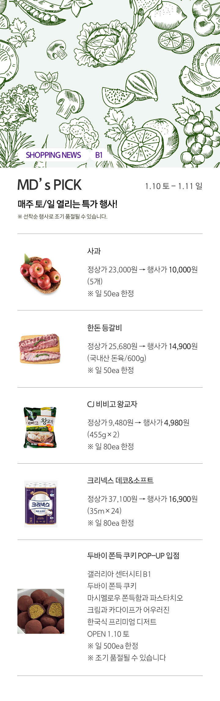 상품행사 MD’s PICK 매주 토/일 열리는 특가 행사! 1.10 토 - 1.11 일 페이스북에 공유하기 카카오스토리로 공유하기 PREV 목록 NEXT 설 선물세트 예약 판매는 아래 번호로 문의 부탁드립니다. 센터시티 041.411.5309, 5311 확인