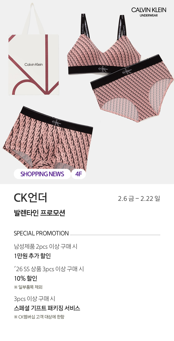 상품행사 CK언더 발렌타인 프로모션 2.6 금 - 2.22 일 페이스북에 공유하기 카카오스토리로 공유하기 PREV 목록 NEXT 설 선물세트 예약 판매는 아래 번호로 문의 부탁드립니다. 센터시티 041.411.5309, 5311 확인