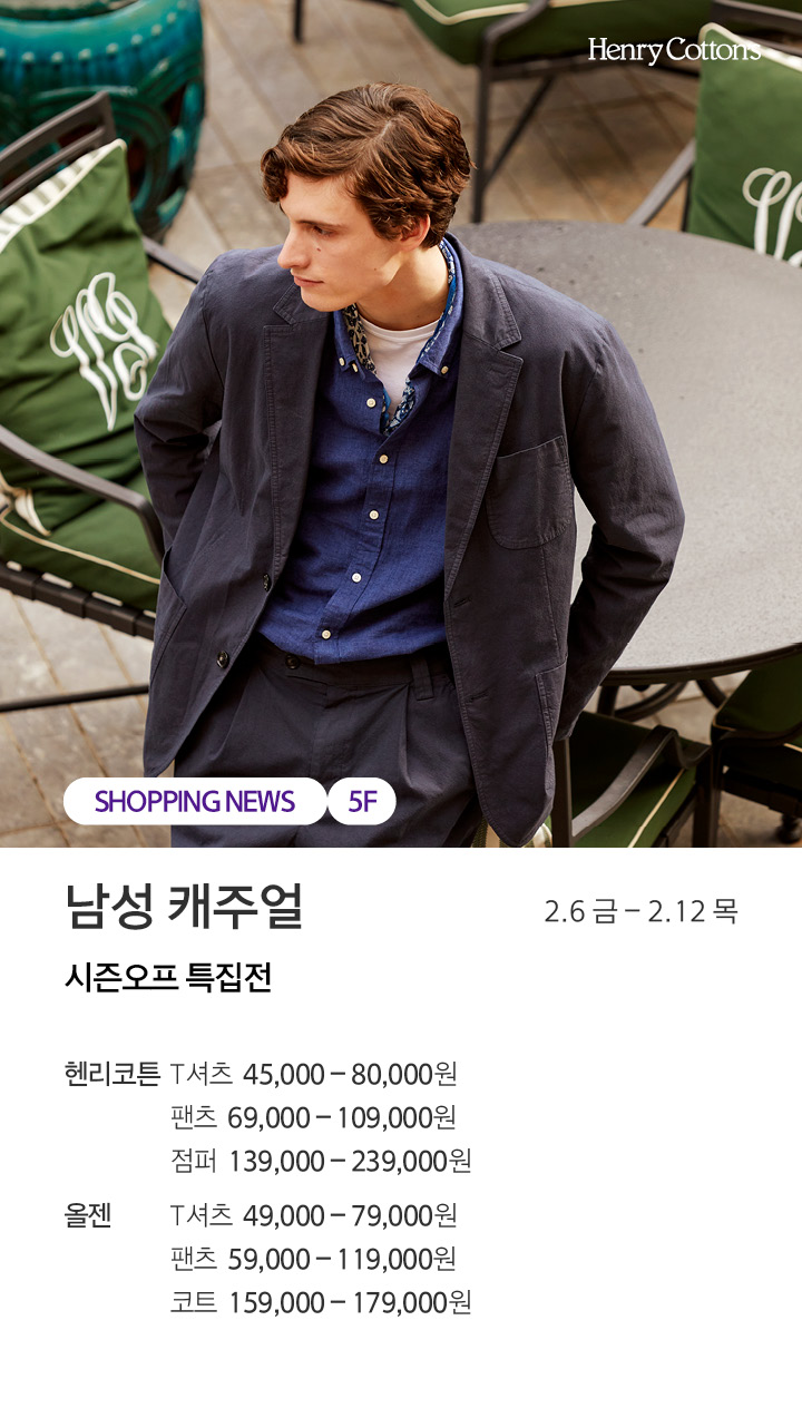 상품행사 남성 캐주얼 시즌오프 특집전 2.6 금 - 2.12 목 페이스북에 공유하기 카카오스토리로 공유하기 PREV 목록 NEXT 설 선물세트 예약 판매는 아래 번호로 문의 부탁드립니다. 센터시티 041.411.5309, 5311 확인