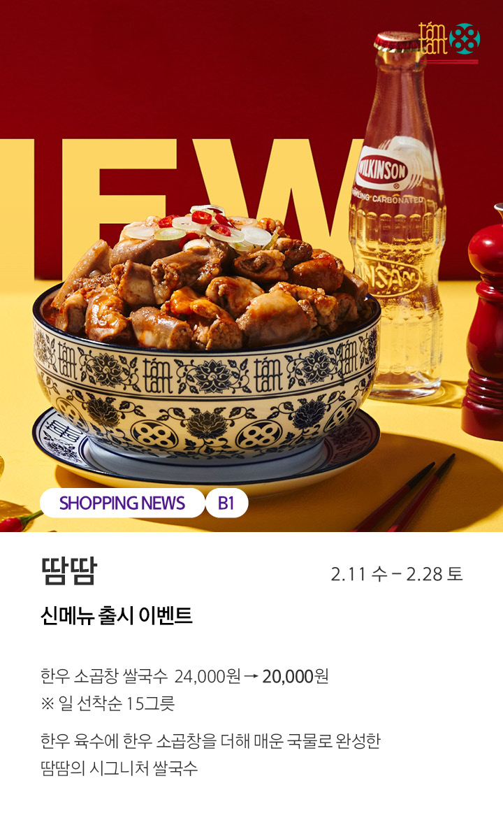 상품행사 땀땀 신메뉴 출시 이벤트 2.11 수 - 2.28 토 페이스북에 공유하기 카카오스토리로 공유하기 PREV 목록 NEXT 설 선물세트 예약 판매는 아래 번호로 문의 부탁드립니다. 센터시티 041.411.5309, 5311 확인