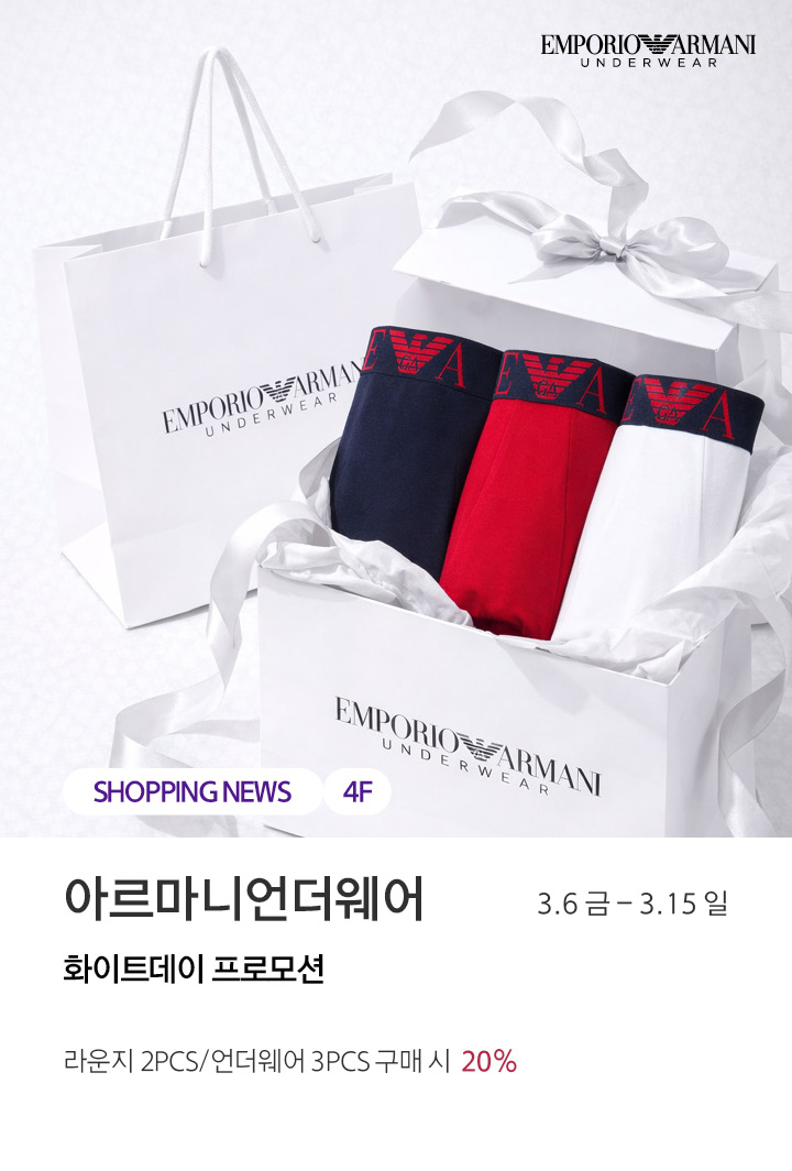 상품행사 아르마니언더웨어 화이트데이 프로모션 3.6 금 - 3.15 일 페이스북에 공유하기 카카오스토리로 공유하기 PREV 목록 NEXT 설 선물세트 예약 판매는 아래 번호로 문의 부탁드립니다. 센터시티 041.411.5309, 5311 확인