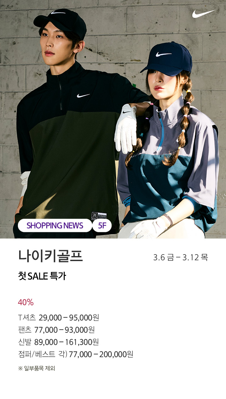 상품행사 나이키골프 첫 SALE 특가 3.6 금 - 3.12 목 페이스북에 공유하기 카카오스토리로 공유하기 PREV 목록 NEXT 설 선물세트 예약 판매는 아래 번호로 문의 부탁드립니다. 센터시티 041.411.5309, 5311 확인