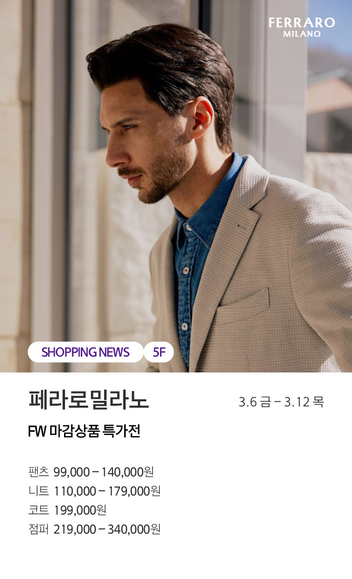 상품행사 페라로밀라노 FW 마감상품 특가전 3.6 금 - 3.12 목 페이스북에 공유하기 카카오스토리로 공유하기 PREV 목록 NEXT 설 선물세트 예약 판매는 아래 번호로 문의 부탁드립니다. 센터시티 041.411.5309, 5311 확인