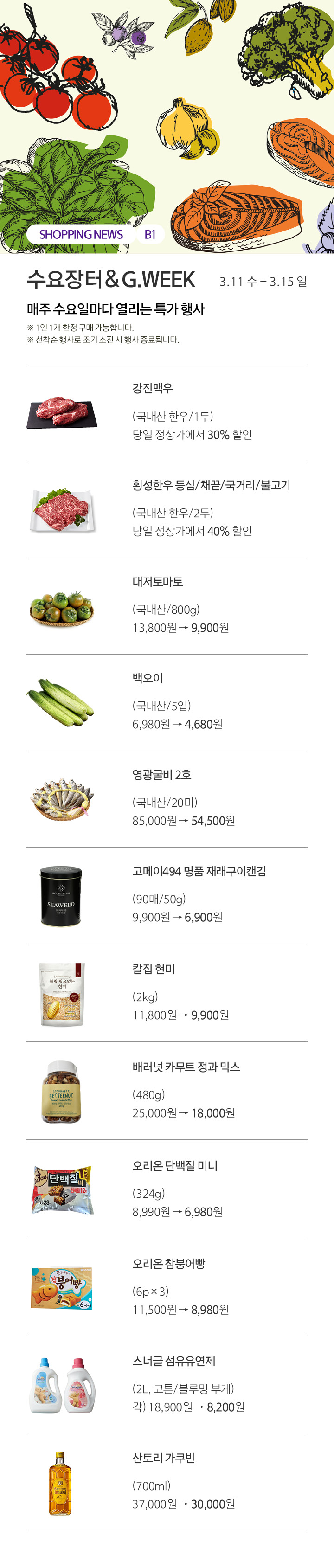 상품행사 수요장터& G.WEEK 매주 수요일마다 열리는 특가 행사 3.11 수 - 3.15 일 페이스북에 공유하기 카카오스토리로 공유하기 PREV 목록 NEXT 설 선물세트 예약 판매는 아래 번호로 문의 부탁드립니다. 센터시티 041.411.5309, 5311 확인