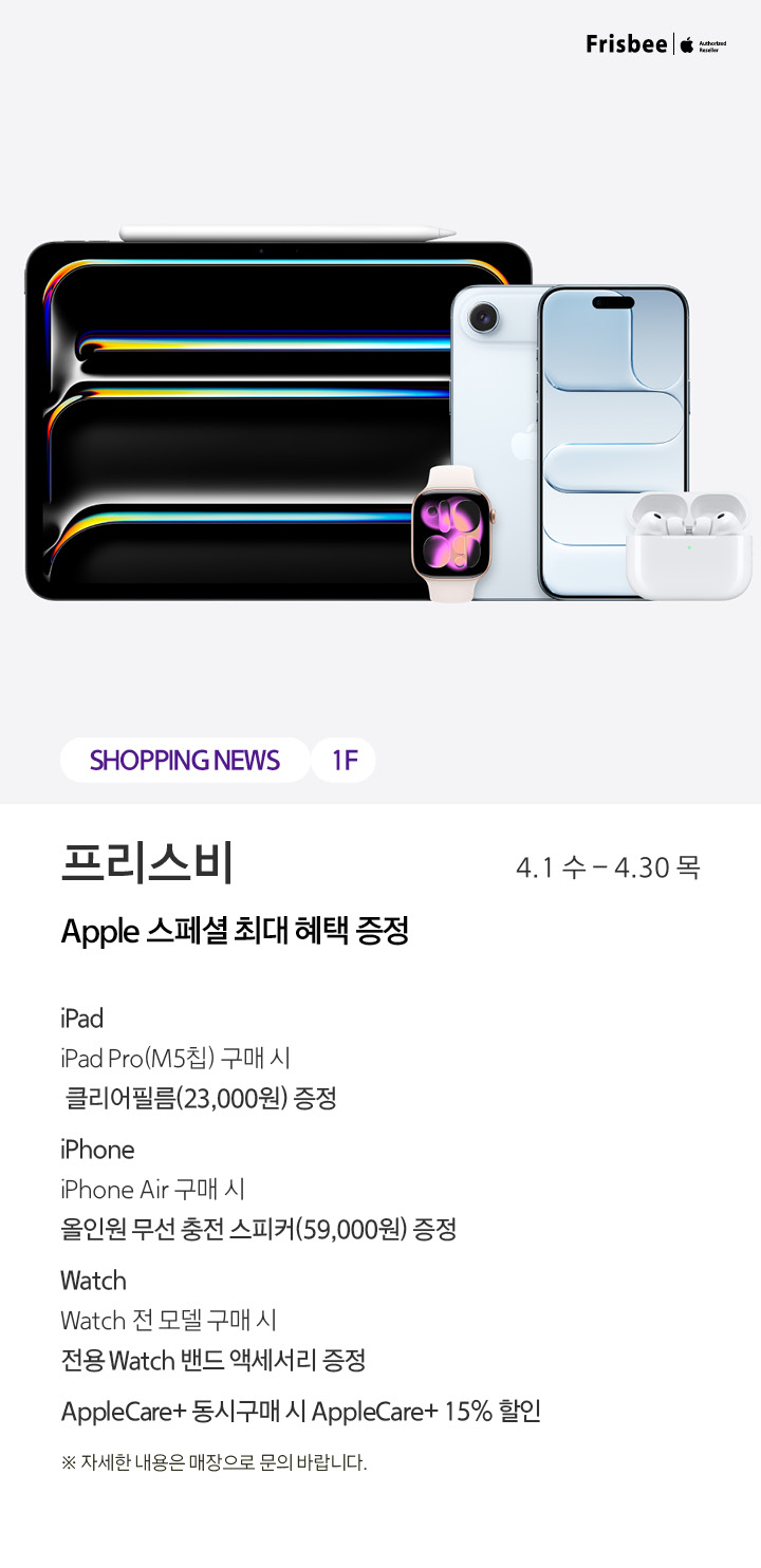 상품행사 프리스비 Apple 스페셜 최대 혜택 증정 4.1 수 - 4.30 목 페이스북에 공유하기 카카오스토리로 공유하기 PREV 목록 NEXT 설 선물세트 예약 판매는 아래 번호로 문의 부탁드립니다. 센터시티 041.411.5309, 5311 확인