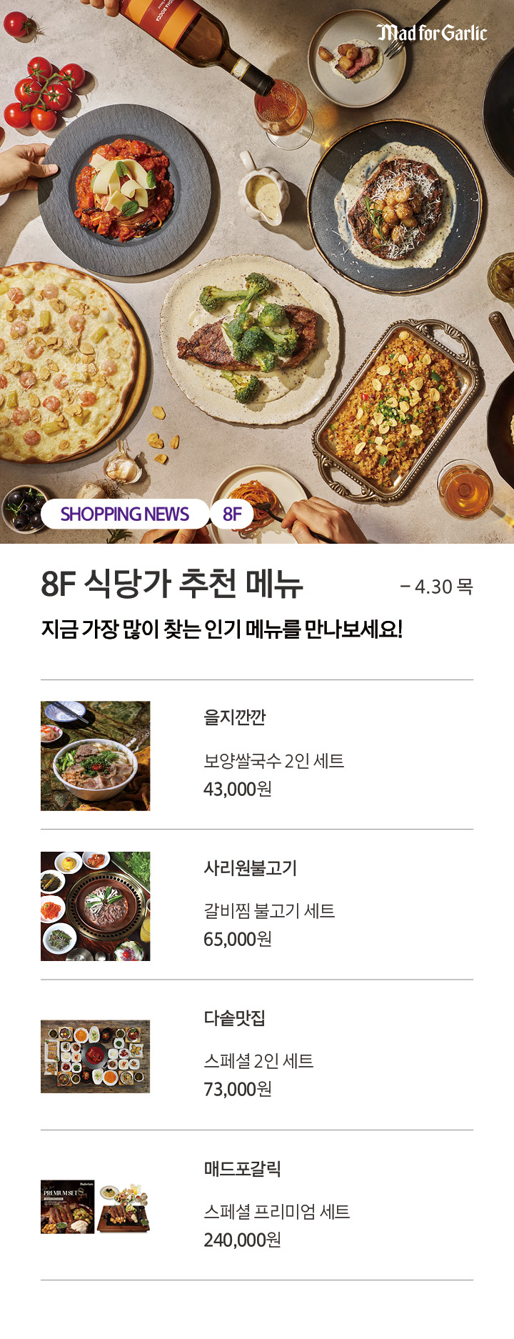 상품행사 8F 식당가 추천 메뉴 지금 가장 많이 찾는 인기 메뉴를 만나보세요! 4.9 목 - 4.30 목 페이스북에 공유하기 카카오스토리로 공유하기 PREV 목록 NEXT 설 선물세트 예약 판매는 아래 번호로 문의 부탁드립니다. 센터시티 041.411.5309, 5311 확인