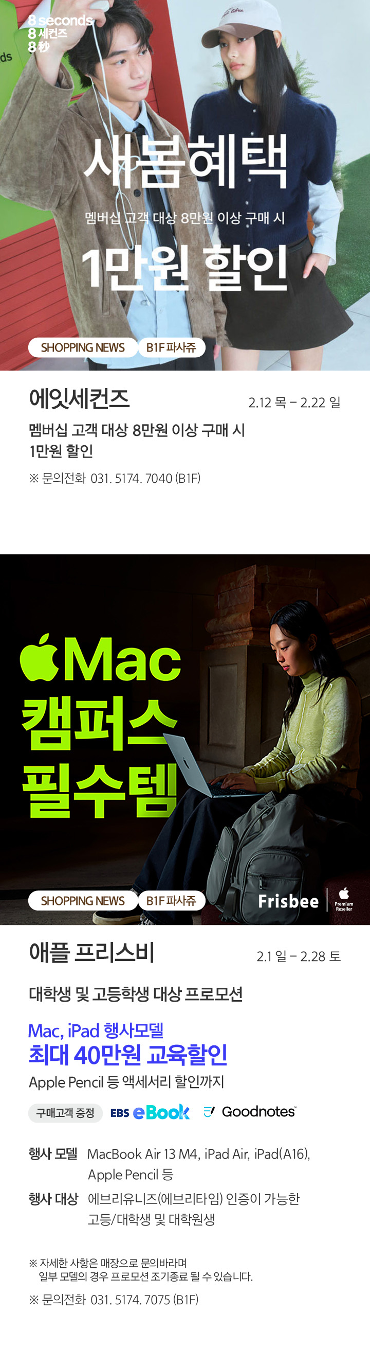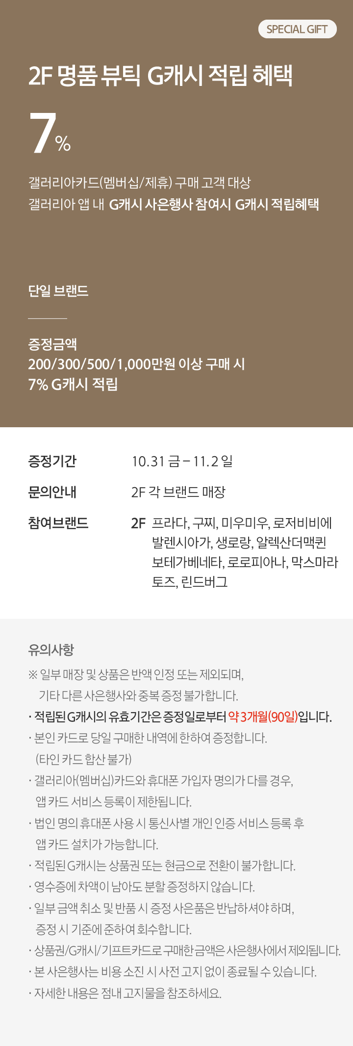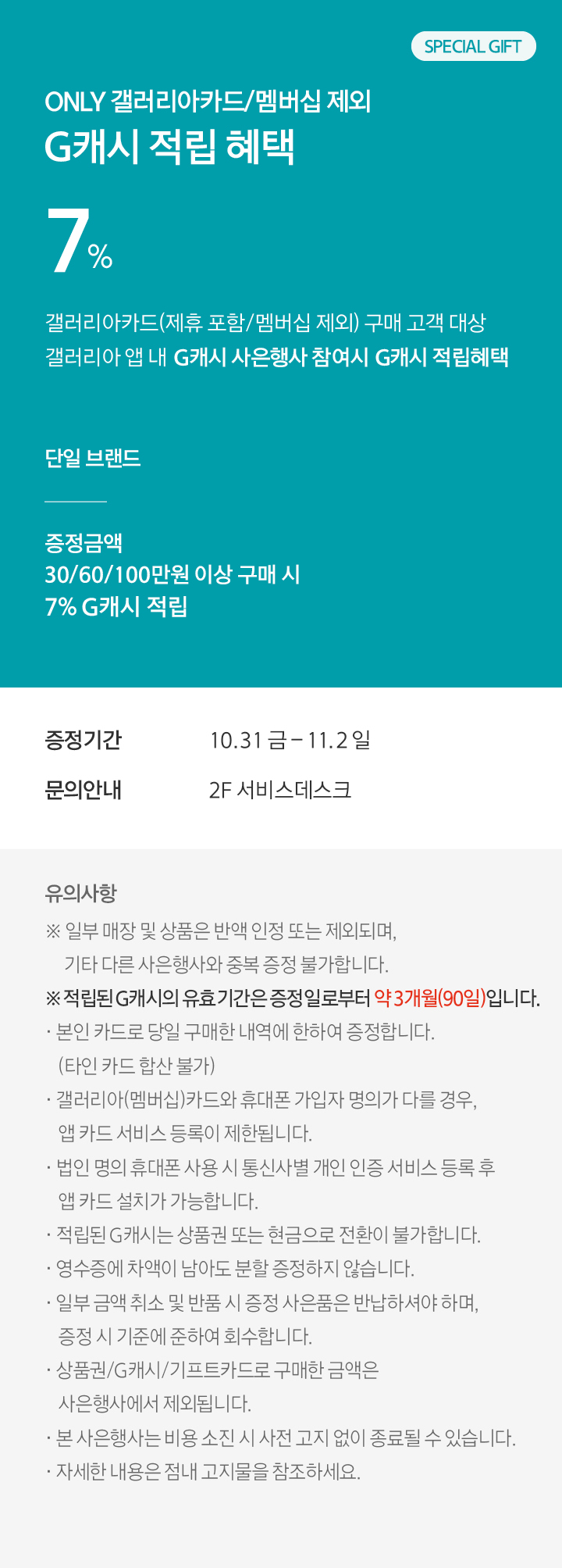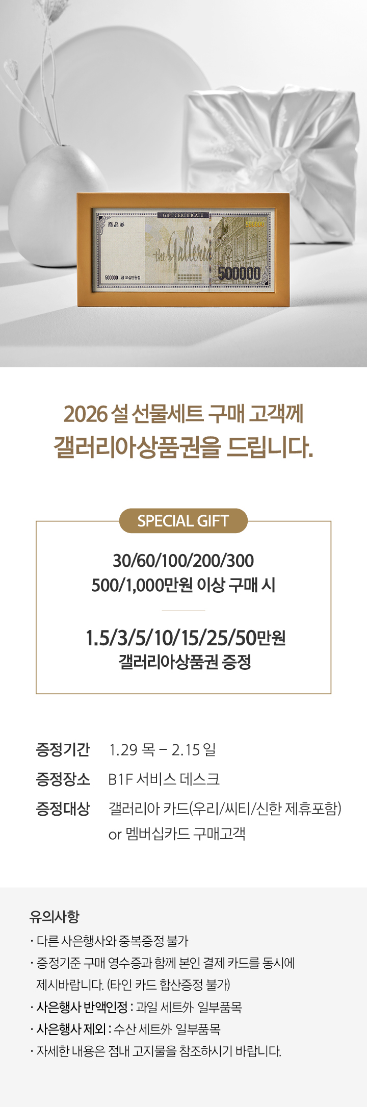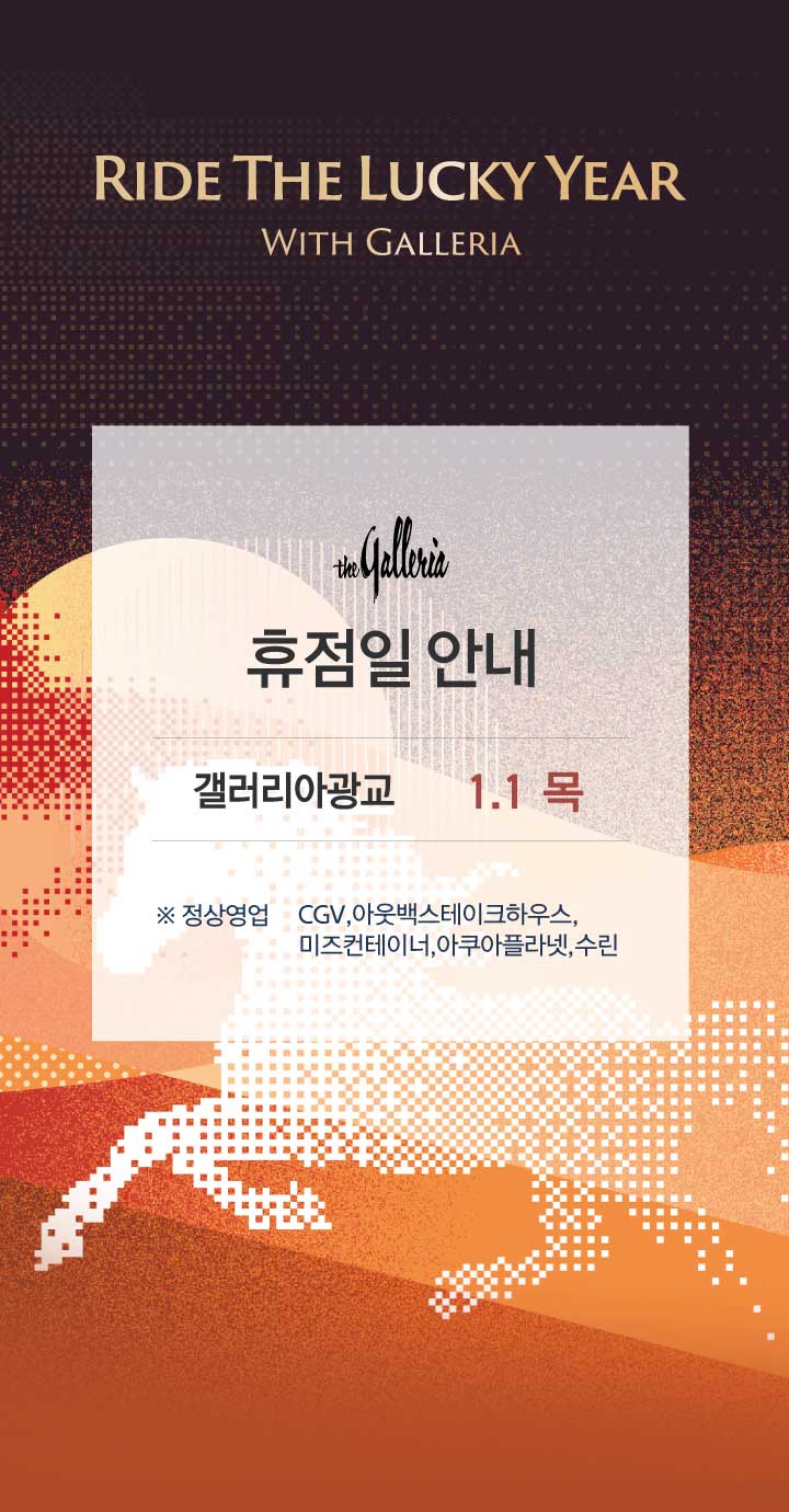 그 동안 갤러리아 수원점을 사랑해주신 고객님께 감사드립니다. 2020년 1월, 수원점은 영업종료 하였습니다. 2020년 2월 28일 오픈하는 갤러리아 광교에서 새로운 모습으로 뵙겠습니다. 감사합니다.