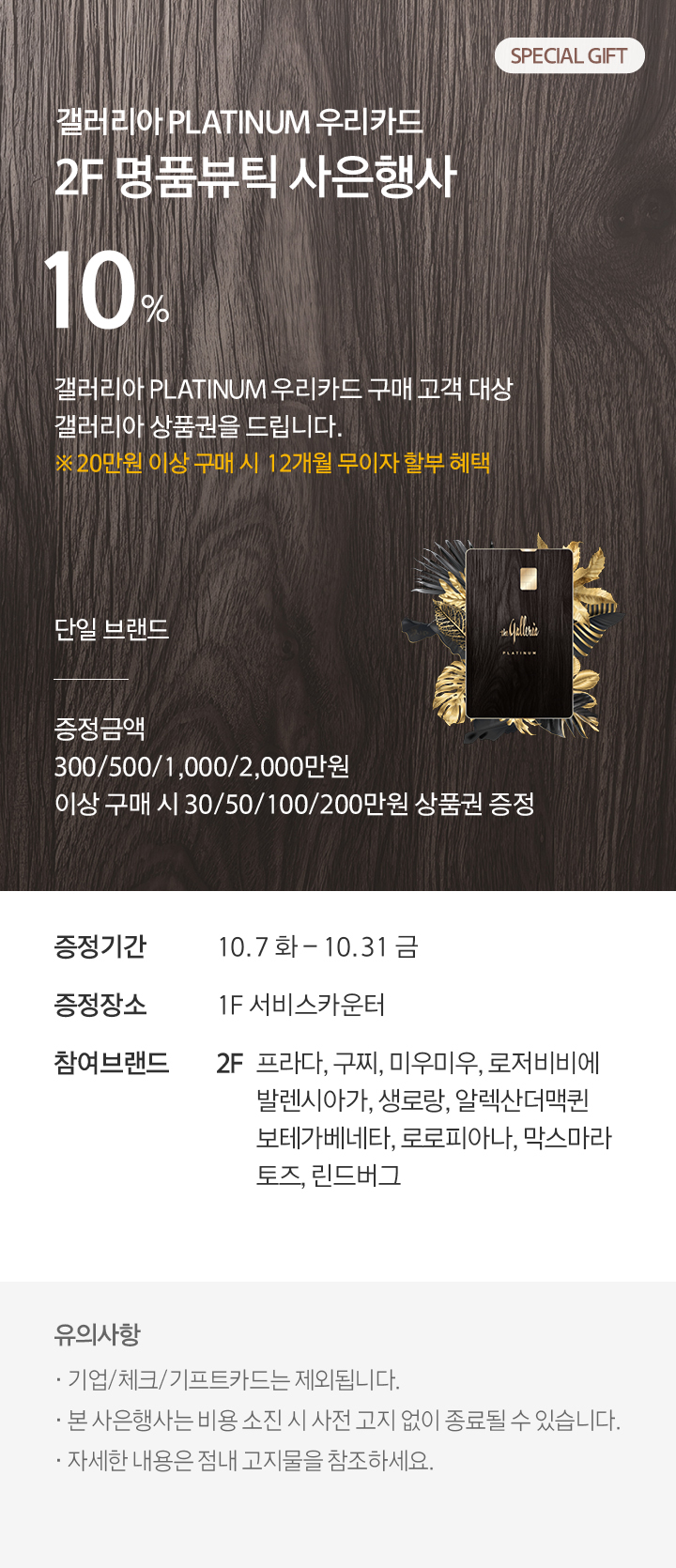 그 동안 갤러리아 수원점을 사랑해주신 고객님께 감사드립니다. 2020년 1월, 수원점은 영업종료 하였습니다. 2020년 2월 28일 오픈하는 갤러리아 광교에서 새로운 모습으로 뵙겠습니다. 감사합니다.