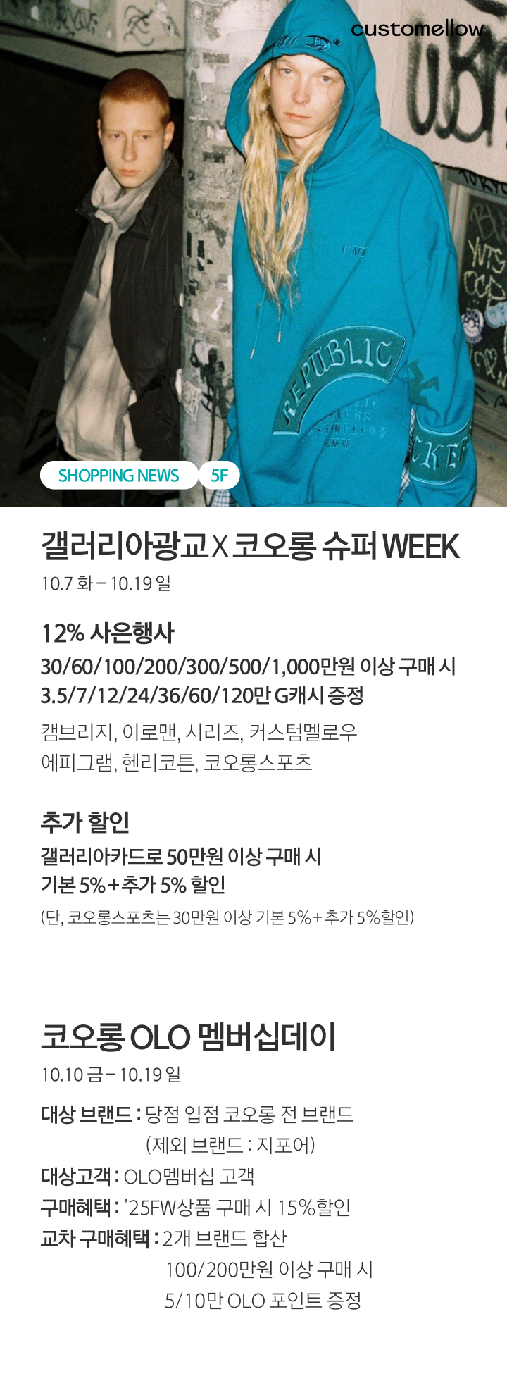 상품행사 SHOPPING NEWS 10.7-10.19, 5F 페이스북에 공유하기 카카오스토리로 공유하기 PREV 목록 NEXT 설 선물세트 예약 판매는 아래 번호로 문의 부탁드립니다. 광교 031.5174.6096-9 확인