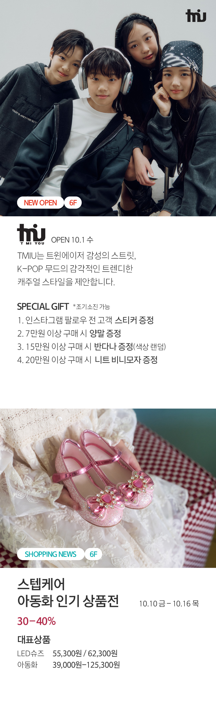 상품행사 SHOPPING NEWS 10.1-10.19, 6F 페이스북에 공유하기 카카오스토리로 공유하기 PREV 목록 NEXT 설 선물세트 예약 판매는 아래 번호로 문의 부탁드립니다. 광교 031.5174.6096-9 확인