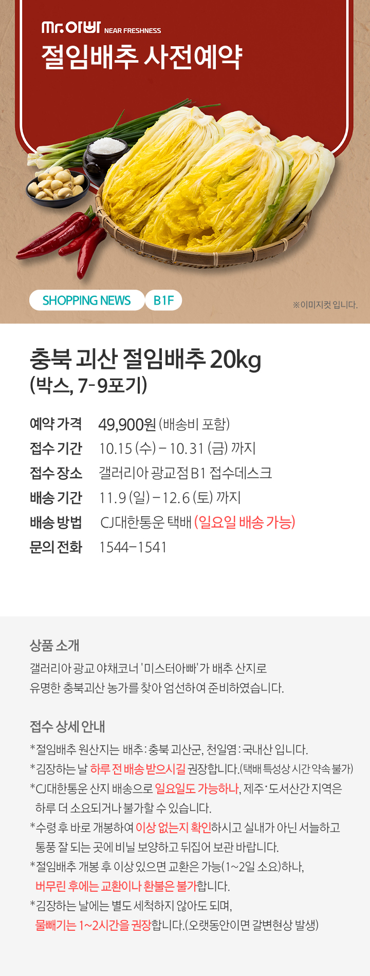 상품행사 SHOPPING NEWS 10.15-10.31 ,B1F 페이스북에 공유하기 카카오스토리로 공유하기 PREV 목록 NEXT 설 선물세트 예약 판매는 아래 번호로 문의 부탁드립니다. 광교 031.5174.6096-9 확인