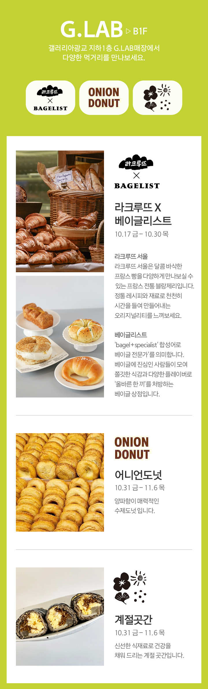 뉴오프닝&팝업 G.LAB 10.17-10.30, B1F 페이스북에 공유하기 카카오스토리로 공유하기 PREV 목록 NEXT 설 선물세트 예약 판매는 아래 번호로 문의 부탁드립니다. 광교 031.5174.6096-9 확인