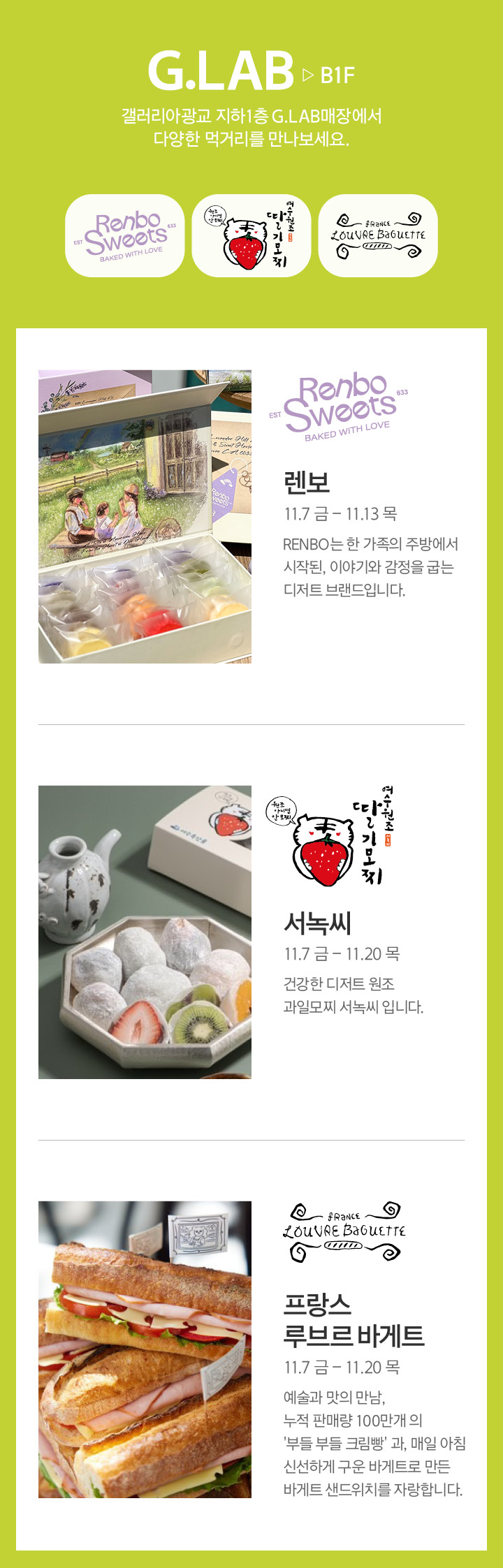 뉴오프닝&팝업 G.LAB 10.31-1120, B1F 페이스북에 공유하기 카카오스토리로 공유하기 PREV 목록 NEXT 설 선물세트 예약 판매는 아래 번호로 문의 부탁드립니다. 광교 031.5174.6096-9 확인