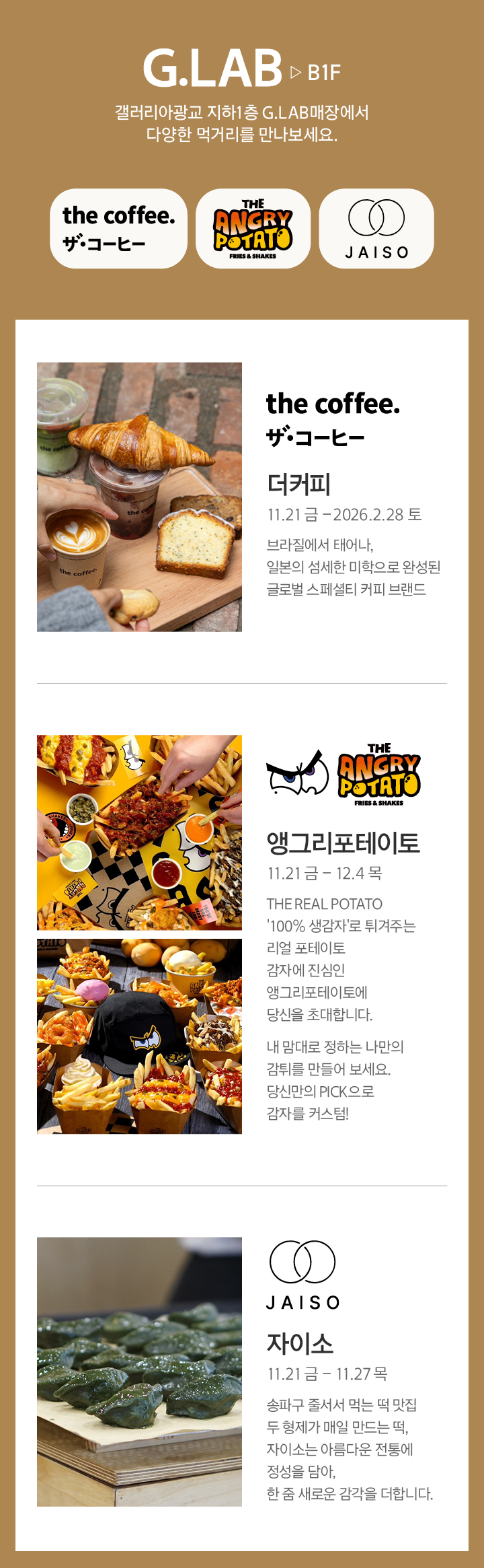 뉴오프닝&팝업 G.LAB 11.21-12.4, B1F 페이스북에 공유하기 카카오스토리로 공유하기 PREV 목록 NEXT 설 선물세트 예약 판매는 아래 번호로 문의 부탁드립니다. 광교 031.5174.6096-9 확인
