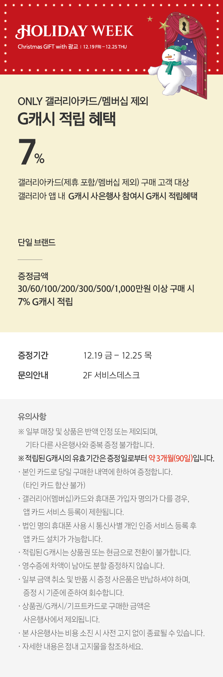 상품행사 7% G캐시 적립 혜택 12.19-12.25, 2F 서비스데스크 페이스북에 공유하기 카카오스토리로 공유하기 PREV 목록 NEXT 설 선물세트 예약 판매는 아래 번호로 문의 부탁드립니다. 광교 031.5174.6096-9 확인