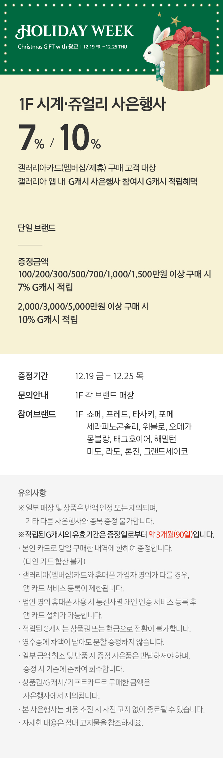 상품행사 7%/10% G캐시적립혜택 12.19-12.25, 1F 각 브랜드 매장 페이스북에 공유하기 카카오스토리로 공유하기 PREV 목록 NEXT 설 선물세트 예약 판매는 아래 번호로 문의 부탁드립니다. 광교 031.5174.6096-9 확인