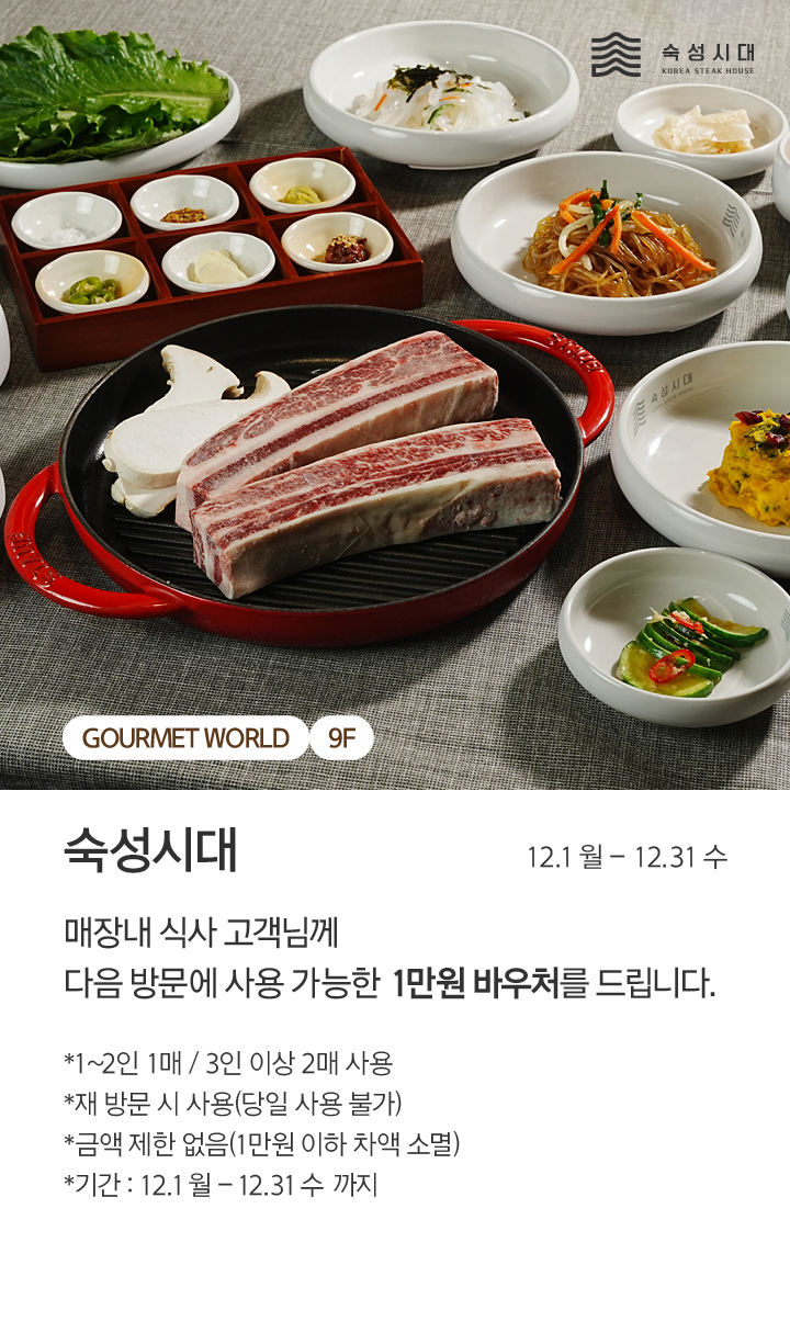 상품행사 GOURMET WORLD 12.1-12.31, 9F 페이스북에 공유하기 카카오스토리로 공유하기 PREV 목록 NEXT 설 선물세트 예약 판매는 아래 번호로 문의 부탁드립니다. 광교 031.5174.6096-9 확인