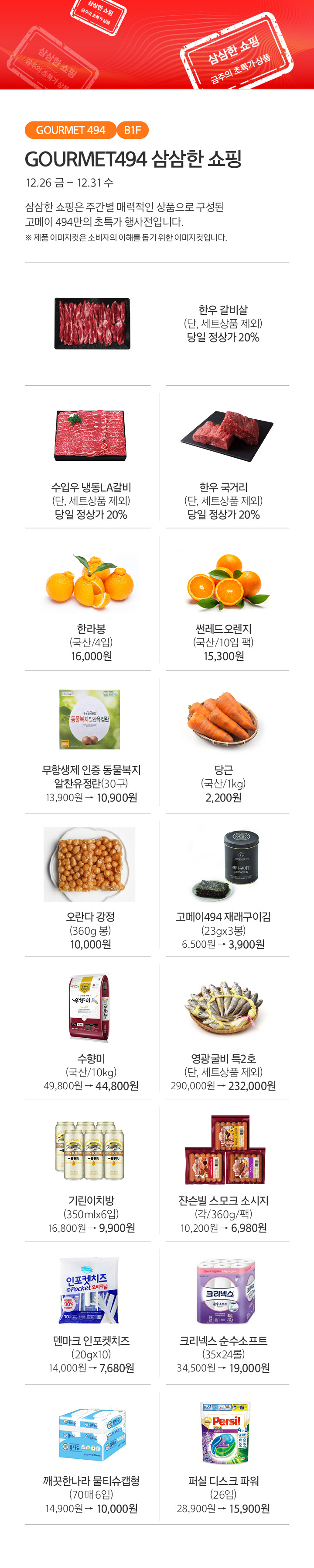 상품행사 GOURMET 494 12.26-12.31, B1F 페이스북에 공유하기 카카오스토리로 공유하기 PREV 목록 NEXT 설 선물세트 예약 판매는 아래 번호로 문의 부탁드립니다. 광교 031.5174.6096-9 확인