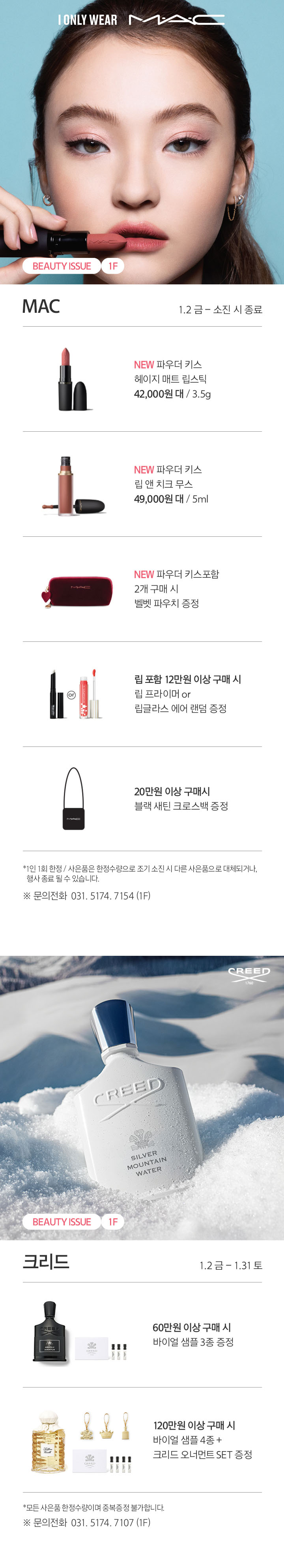 상품행사 BEAUTY ISSUE 1.2-1.31, 1F 페이스북에 공유하기 카카오스토리로 공유하기 PREV 목록 NEXT 설 선물세트 예약 판매는 아래 번호로 문의 부탁드립니다. 광교 031.5174.6096-9 확인