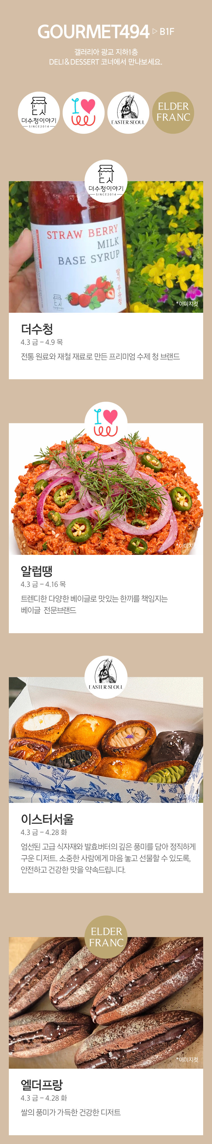 뉴오프닝&팝업 GOURMET 494 4.3-, B1F 페이스북에 공유하기 카카오스토리로 공유하기 PREV 목록 NEXT 설 선물세트 예약 판매는 아래 번호로 문의 부탁드립니다. 광교 031.5174.6096-9 확인