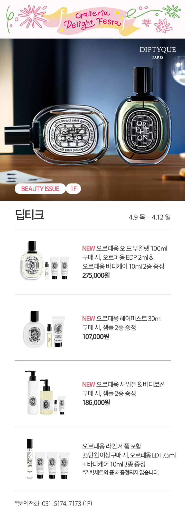 상품행사 BEAUTY ISSIUE 4.9-4.12, 1F 페이스북에 공유하기 카카오스토리로 공유하기 PREV 목록 NEXT 설 선물세트 예약 판매는 아래 번호로 문의 부탁드립니다. 광교 031.5174.6096-9 확인