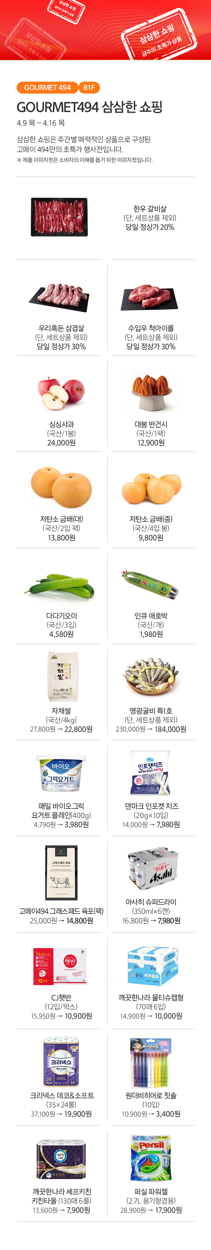 상품행사 GOURMET 494 4.9-4.16, B1F 페이스북에 공유하기 카카오스토리로 공유하기 PREV 목록 NEXT 설 선물세트 예약 판매는 아래 번호로 문의 부탁드립니다. 광교 031.5174.6096-9 확인