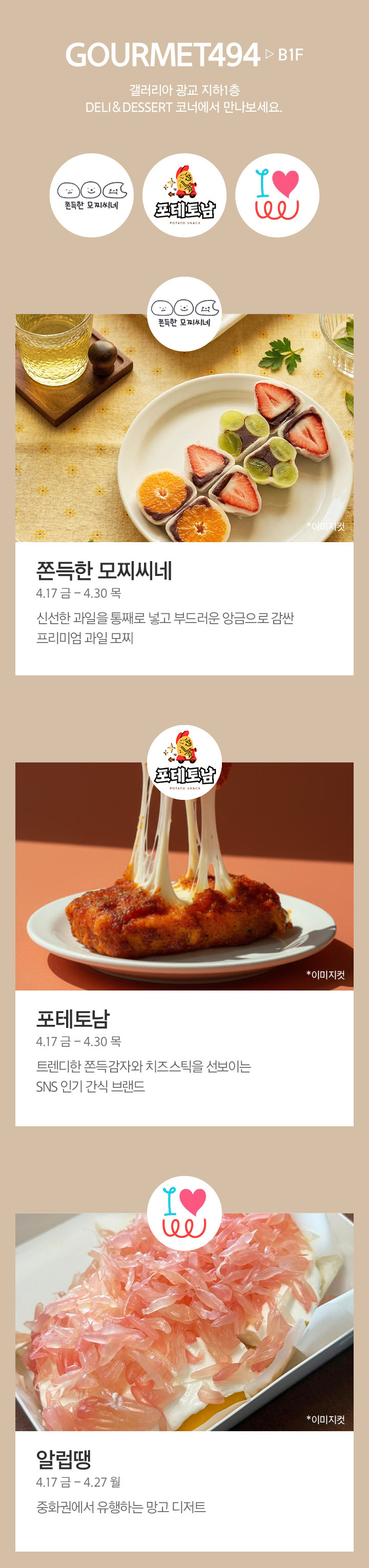 뉴오프닝&팝업 GOURMET 494 4.17-4.30 , B1F 페이스북에 공유하기 카카오스토리로 공유하기 PREV 목록 NEXT 설 선물세트 예약 판매는 아래 번호로 문의 부탁드립니다. 광교 031.5174.6096-9 확인