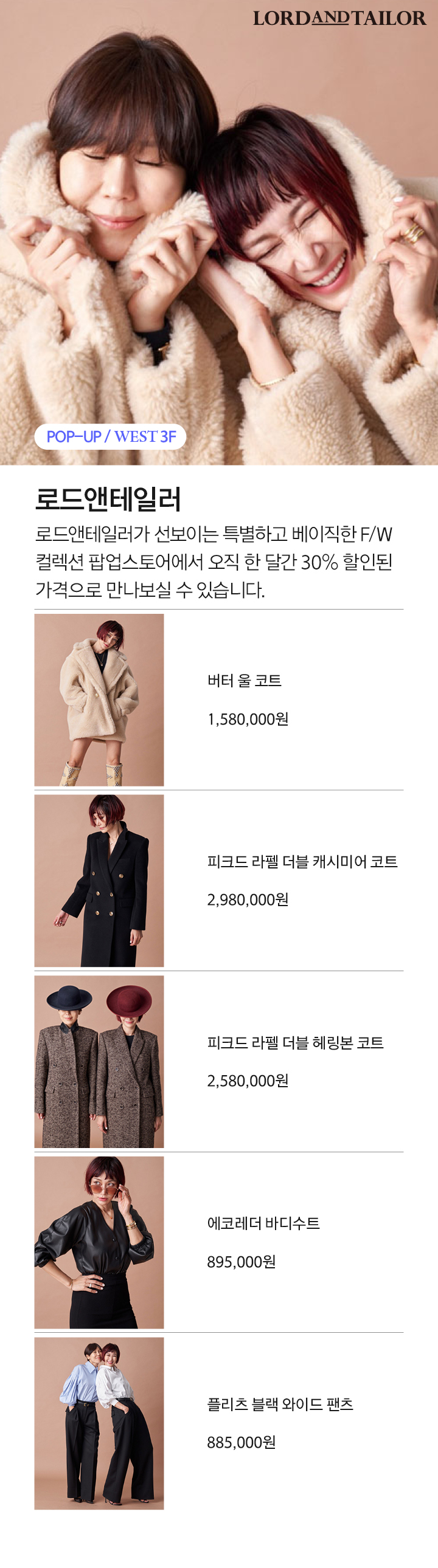 뉴오프닝&팝업 POP UP - 로드앤테일러 0 페이스북에 공유하기 카카오스토리로 공유하기 PREV 목록 NEXT 설 선물세트 예약 판매는 아래 번호로 문의 부탁드립니다. 명품관 02.3449.4061 확인