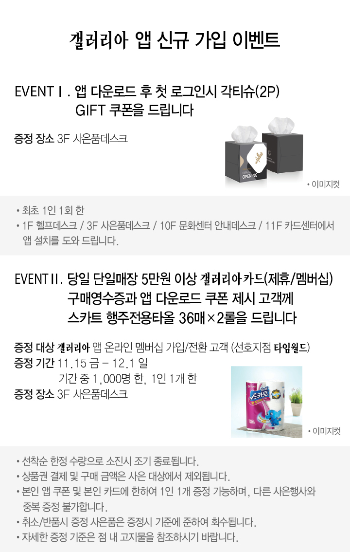 그 동안 갤러리아 수원점을 사랑해주신 고객님께 감사드립니다. 2020년 1월, 수원점은 영업종료 하였습니다. 2020년 2월 28일 오픈하는 갤러리아 광교에서 새로운 모습으로 뵙겠습니다. 감사합니다.