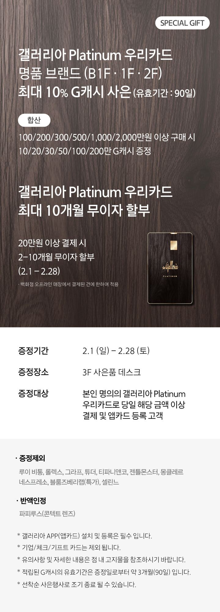 그 동안 갤러리아 수원점을 사랑해주신 고객님께 감사드립니다. 2020년 1월, 수원점은 영업종료 하였습니다. 2020년 2월 28일 오픈하는 갤러리아 광교에서 새로운 모습으로 뵙겠습니다. 감사합니다.